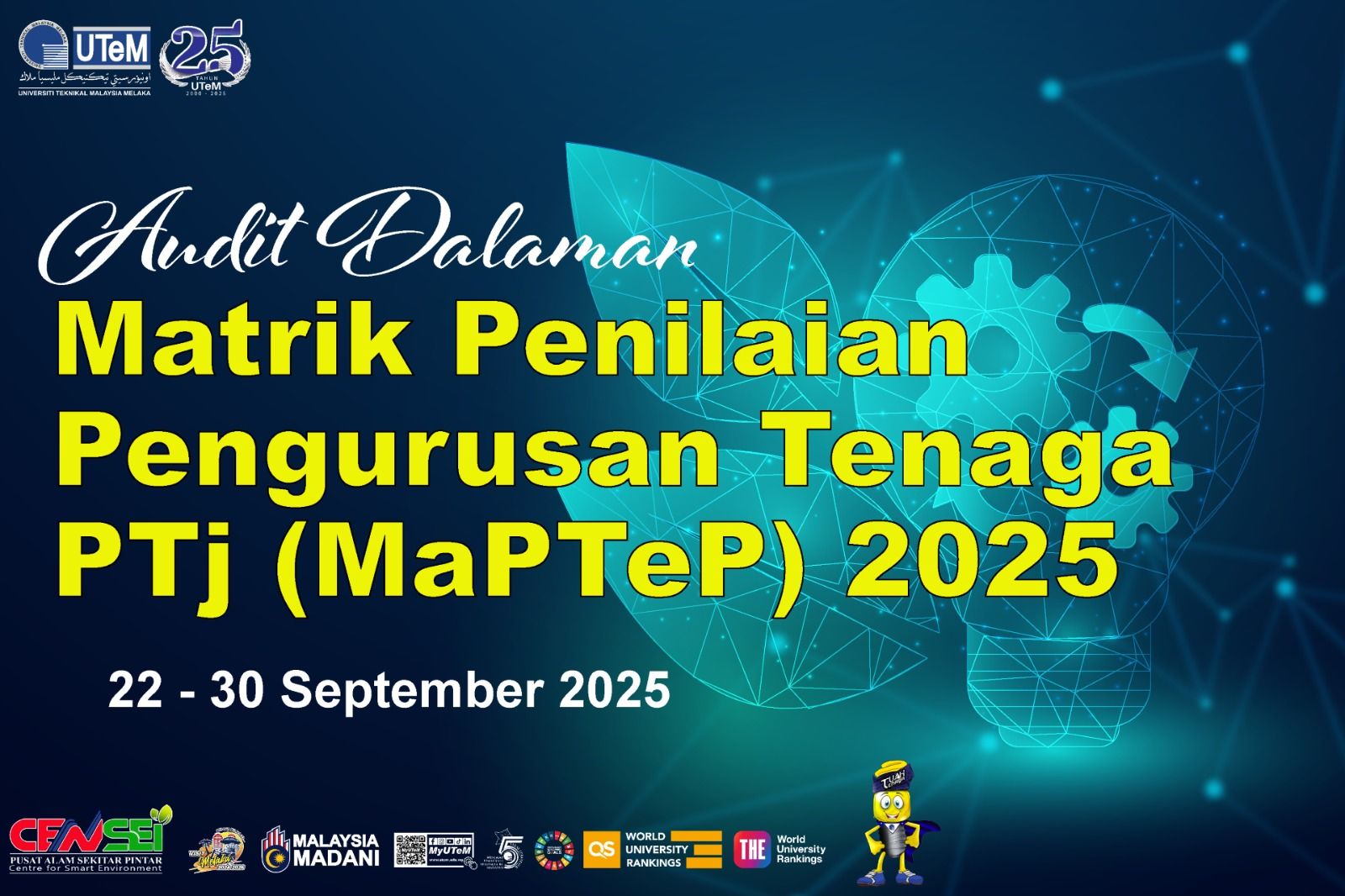 Dimaklumkan bahawa Jawatankuasa Pengurusan Tenaga UTeM akan melaksanakan audit dalaman Matrik Penilaian Sistem Pengurusan Tenaga Pusat Tanggungjawab (MaPTeP) 2025 di Kompleks Penyelidikan dan Inovasi (KPI) pada ketetapan berikut: